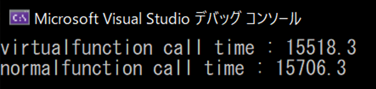 下記のように、100億回呼び出すようなコードを実行してみるとまあまあ差が出てくることがわかる。 1億ぐらいであれば誤差もしくはたまに仮想関数呼び出しのほうが早く終わるケースも出てくる。
